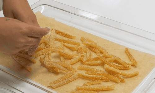 Подсохшие, но еще липкие апельсиновые цукаты обвалять в сахаре.