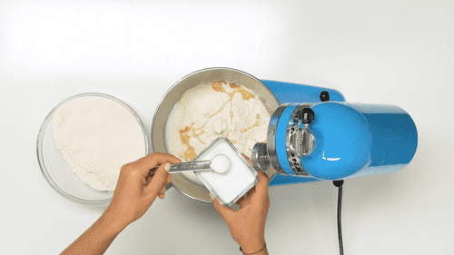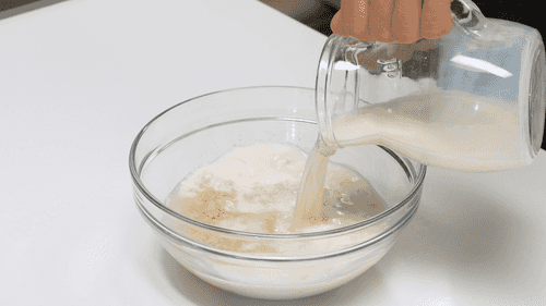 Теплую воду и 250 мл теплого молока смешать с сахаром и дрожжами. Оставить на 5 минут.