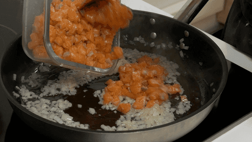 Затем добавить нарезанную небольшими кубиками рыбу и обжаривать пару минут. Рыба не должна полностью приготовиться.