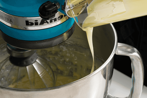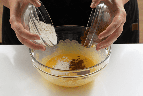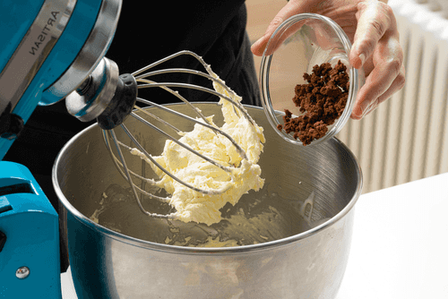 К желткам добавить муку, молоко и какао, все тщательно взбить миксером.