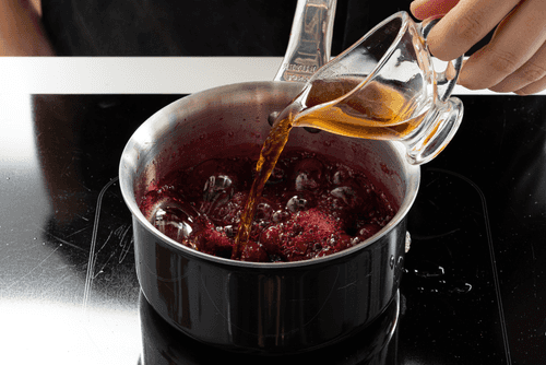 Приготовить начинку. Вишню с сахаром (40 г) всыпать в сотейник, добавить 3 ст. л. воды и уваривать 7 минут на среднем огне, чтобы вишня дала сок. В самом конце добавить бренди, прогревать еще минуту, помешивая.