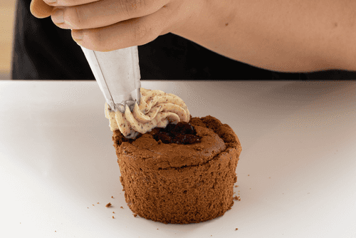 Мини-кексики остудить, достать из формы. Аккуратно сверху вынуть немного мякиша. Раскрошить этот мякиш и вмешать в крем.