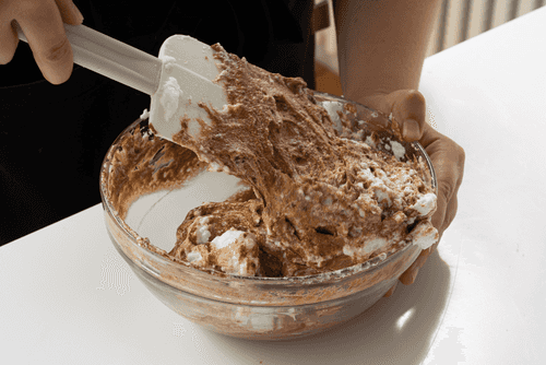 Затем по частям ввести лопаткой взбитые белки, стараясь, чтобы они остались воздушными.