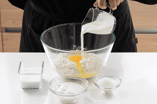 Муку просеять. Замесить тесто из муки, кефира, сметаны, 1 яйца, 1 столовой ложки сахара и 1/2 столовой ложки соли. Дать ему постоять 10 минут.