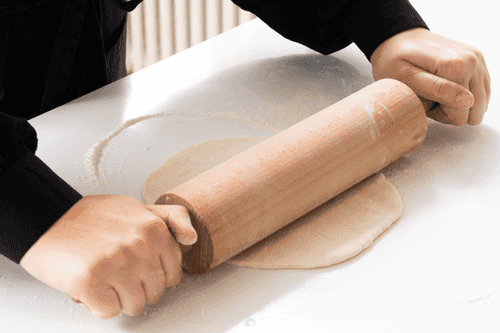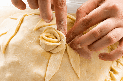 Разделить тесто на четыре части. Каждую раскатать в пласт толщиной 5 мм и присыпать мукой. С помощью большой кастрюли или тарелки из трех пластов вырезать одинаковые круги (обрезки теста пригодятся для украшения). Четвертый пласт оставить таким, как есть.