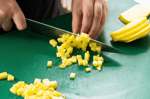 Картофель очистить, нарезать небольшими кубиками и залить холодной водой, чтобы не потемнел.