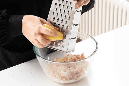 Курицу также нарезать кубиками, смешать с натертым сыром, посолить, поперчить.