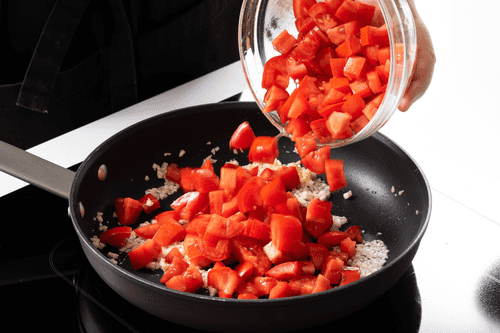 Хорошо разогреть сковороду с растительным маслом, обжарить чеснок 1 минуту, затем добавить помидоры, готовить еще 2 минуты.