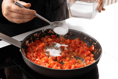 Добавить к помидорам 1 столовую ложку сахара и сухой чабрец, посолить. Все хорошо перемешать и снять с огня.
