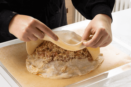 Закрыть весь пирог оставшимся пластом теста, соединить края пласта с самым нижним кругом, лишнее отрезать. Защипнуть косичкой края пирога.