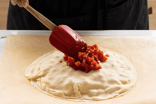 Накрыть вторым кругом из теста, на него выложить начинку из помидоров. Накрыть последним кругом теста и выложить поверх курицу с сыром.