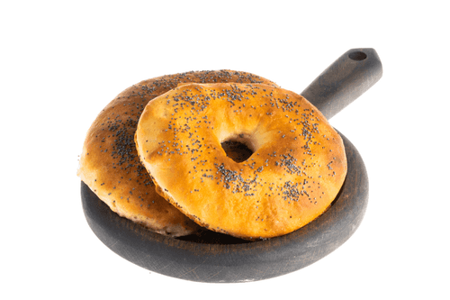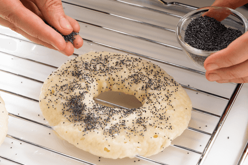 Каждый бублик еще слегка растянуть и подправить его форму руками, затем опустить в кипяток. Дать ему обвариться 5 секунд. Достать шумовкой и переложить на решетку. Посыпать бублики маком. Переложить бублики посыпкой вверх на застеленный пергаментом противень и выпекать 15–20 мин. Каждый бублик должен зазолотиться, но ни в коем случае не подгореть.