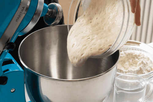Когда опара вспенится, переложить ее в чашу миксера с насадкой-крюком. Просеять туда же 350 грамм муки, добавить еще 2 грамма дрожжей, 50 грамм сахара, 1 чайную ложку соли, влить 60 мл воды. Начать вымешивать тесто.