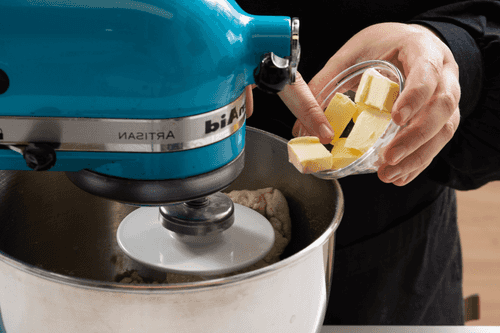 Когда вся мука станет влажной, по маленькому кусочку начать вмешивать сливочное масло. Через 6–8 минут, когда будет вмешано все масло, должно получиться гладкое, очень плотное и тянущееся тесто.