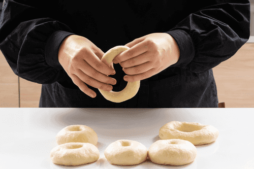 Затем аккуратно растянуть дырки в шариках, чтобы они приняли форму бубликов. Выложить бублики на застеленную пергаментом поверхность, накрыть пленкой и оставить на 1,5–2 часа расстояться. Дольше расстаивать их не нужно, иначе текстура выпечки нарушится.