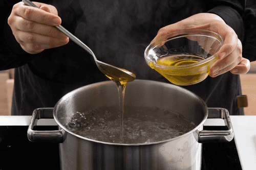 К концу расстойки разогреть духовку до 240 градусов и вскипятить воду в большой широкой кастрюле. Вмешать в воду мед, уменьшить огонь до минимума. Рядом выложить решетку, на которую нужно будет перекладывать бублики, и подготовить шумовку.