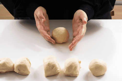 Разделить тесто на шесть частей и с силой скатать их в шарики, они должны быть плотными. Выложить шарики на доску, накрыть пленкой и дать тесту отдохнуть и подняться 20 минут.