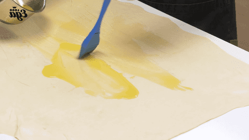 Раскатать тесто в тонкий пласт, смазать его топленым маслом и скатать в плотный рулет.