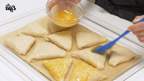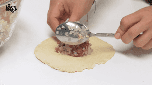 выложить на них фарш и закрыть их внахлест, придавая самсе треугольную форму. Уголки треугольников немного загнуть и прижать.