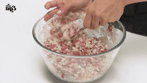 Смешать мясо с луком, добавить чайную ложку соли, перец и зиру.