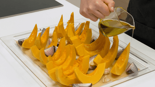 Тыкву очистить, избавить от семян и нарезать дольками толщиной 2,5 см, лук не очищать и нарезать четвертинками. Выложить тыкву, лук и целые неочищенные зубчики чеснока на противень, смазать оливковым маслом, посолить, поперчить и отправить в духовку, разогретую до 200 градусов, на час или до мягкости. Готовым овощам дать немного остыть.