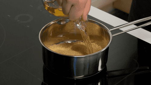 В небольшом сотейнике смешать сахар с уксусом, подогреть на небольшом огне до растворения сахара. Это займет около 5 минут.