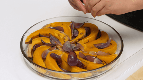 В круглую форму диаметром 28 см вылить смесь уксуса и сахара, бросить листья тимьяна, выложить дольки тыквы, очистить лук и чеснок от кожицы и выложить их к тыкве.