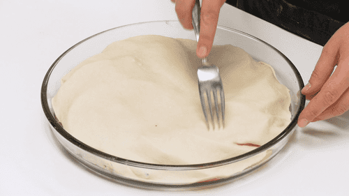Раскатать слоеное тесто, вырезать из него круг размером с форму для запекания, выложить тесто поверх овощей и заправить края внутрь. Наколоть тесто вилкой и отправить пирог в духовку на 35–40 минут.