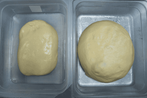 Переложить тесто в подмасленный бокс с крышкой и оставить при комнатной температуре. Через 50 минут достать, обмять тесто, убрать еще на 50 минут, обмять снова и оставить еще на 40 минут. Тесто должно увеличиться в объеме примерно в три раза.