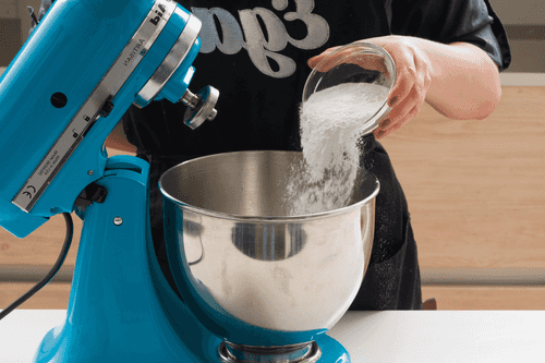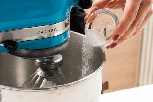 Добавить сахарную пудру и начать мешать миксером на небольшой скорости.