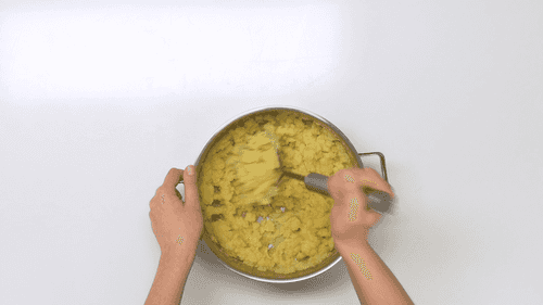 Готовый картофель размять в неоднородное пюре — лучше, если будут попадаться кусочки.