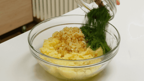 Добавить укроп и жареный лук к картошке, посолить, поперчить и хорошо перемешать.