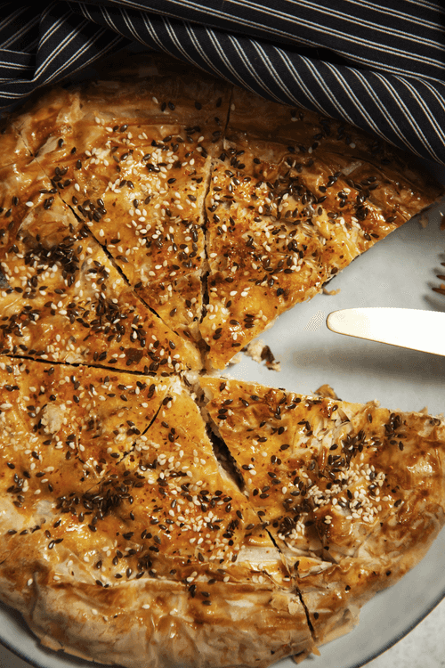 Пирог из теста фило с фетой, творогом и шпинатом — яркое воплощение греческой кулинарной традиции, где тонкие, хрустящие слои теста соединяются с нежной, сливочной начинкой. Этот рецепт берет свое начало в Средиземноморье, где сыр фета является неотъемлемой частью гастрономии. Солоноватый вкус феты прекрасно гармонирует с мягким творогом и свежестью шпината, создавая насыщенный, но сбалансированный букет вкусов. При запекании пирог приобретает золотистую корочку, а внутри остается сочным и нежным. Он идеально подходит как для праздничного застолья, так и для уютного семейного ужина. Особенно вкусен в теплом виде, но даже охлажденный сохраняет свою привлекательность. Подача с греческим йогуртом или легким соусом из зелени усилит его вкусовые оттенки, делая этот пирог настоящим кулинарным шедевром.
