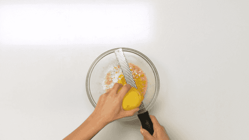 Смешать 90 грамм сахара, крахмал, разрыхлитель, соль и лимонную цедру.
