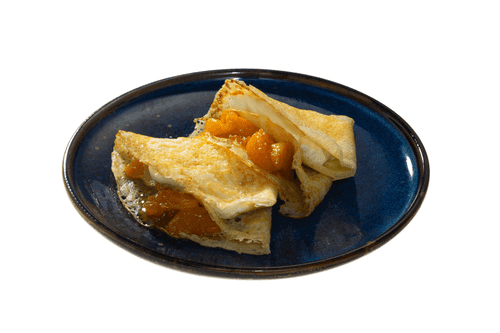 На половину блина выложить мандариновый мармелад, на вторую — крем из маскарпоне. Свернуть блины вчетверо и в таком виде подавать.