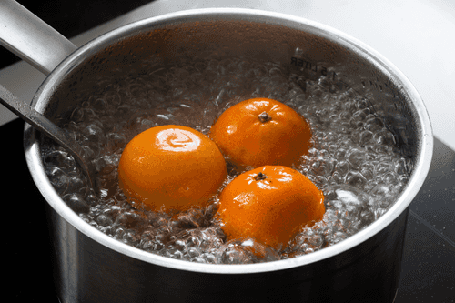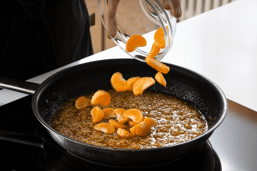 Добавить дольки мандаринов на сковороду и готовить еще 4–5 минут. Снять с огня и остудить.