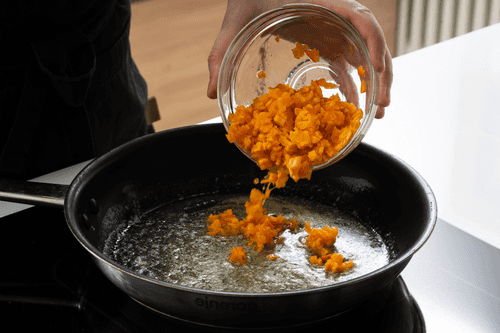 Растопить сливочное масло на сковороде, выложить мандарины и обжаривать 1 минуту, постоянно помешивая.
