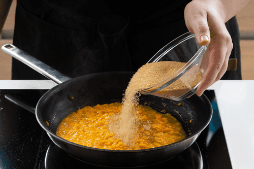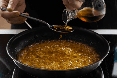 Всыпать сахар и жарить, помешивая, 5 минут, чтобы мандарины покрылись карамелью.