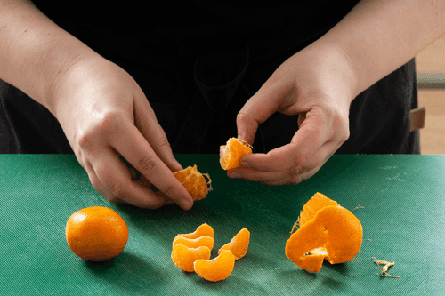 Оставшиеся мандарины очистить, разделить на дольки, постараться убрать все белые нити и прожилки.
