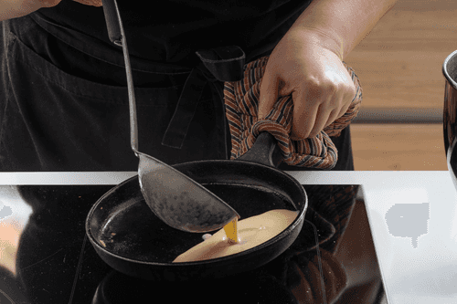 Разогреть блинную сковороду — для первого блина можно смазать ее растительным маслом, а последующие можно жарить и без него. Вылить на сковороду немного теста и распределить его по всей поверхности.