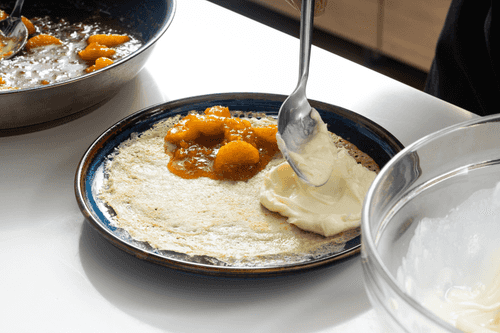 Блины с мандариновым мармеладом, маскарпоне и сгущенным молоком