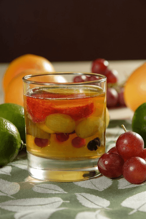 Горячий сироп процедить сквозь полотно, слегка охладить его, разлить в вазочки или формы слоем 1–2 см и дать застыть. На застывший слой желе уложить различные фрукты и снова залить их полузастывшим желе так, чтобы оно покрыло поверхность фруктов, и снова охладить.