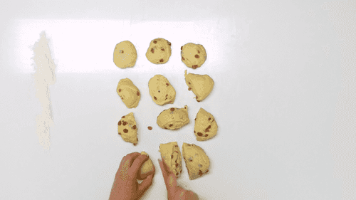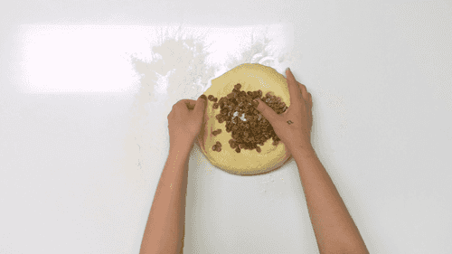 Поднявшееся тесто выложить на рабочую поверхность, подпыленную мукой, на тесто выложить изюм и вмешать его в тесто. Изюм должен равномерно распределиться по тесту.