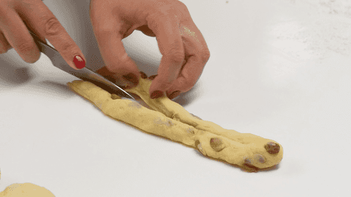 Раскатать часть теста в колбаску, разрезать ее вдоль пополам, не дорезая с одной стороны.