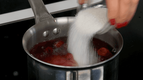 В кастрюле довести воду до кипения, добавить в нее сахар и 150 г вишни. Варить 10 минут.