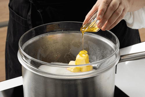 Сливочное масло (35 г), мед и сахар (100 г) растопить на водяной бане, смешав до однородности.
