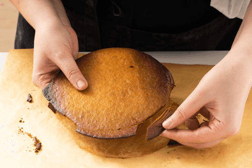 Выпекать коржи в разогретой до 200 градусов духовке 7–10 минут. Пока они теплые, коржи обрезать в ровные круги. Обрезки сохранить. Коржи полностью остудить.
