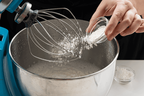 Тонкой струйкой, не переставая размешивать, влить в яичную массу теплое молоко.