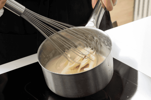 Приготовить крем. Влить в сотейник молоко и разогреть, не доводя до кипения.