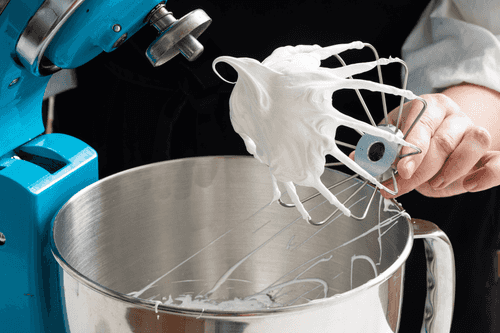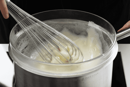 Вылить горячую смесь в чашу миксера и начать взбивать, постепенно увеличивая скорость. Взбивать смесь около 13–14 минут, пока смесь не будет хорошо держаться на венчике и не станет плотной и блестящей.